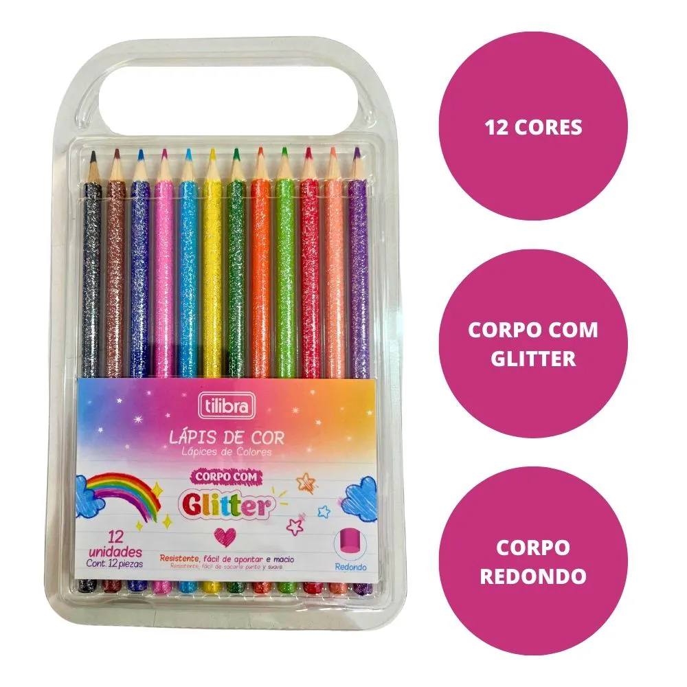 LÁPIS DE COR CORPO COM GLITTER C/ 12 UNIDADES TILIBRA