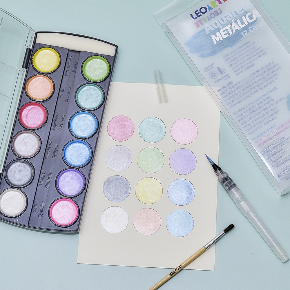 AQUARELA 12 CORES METÁLICAS, COM WATER BRUSH